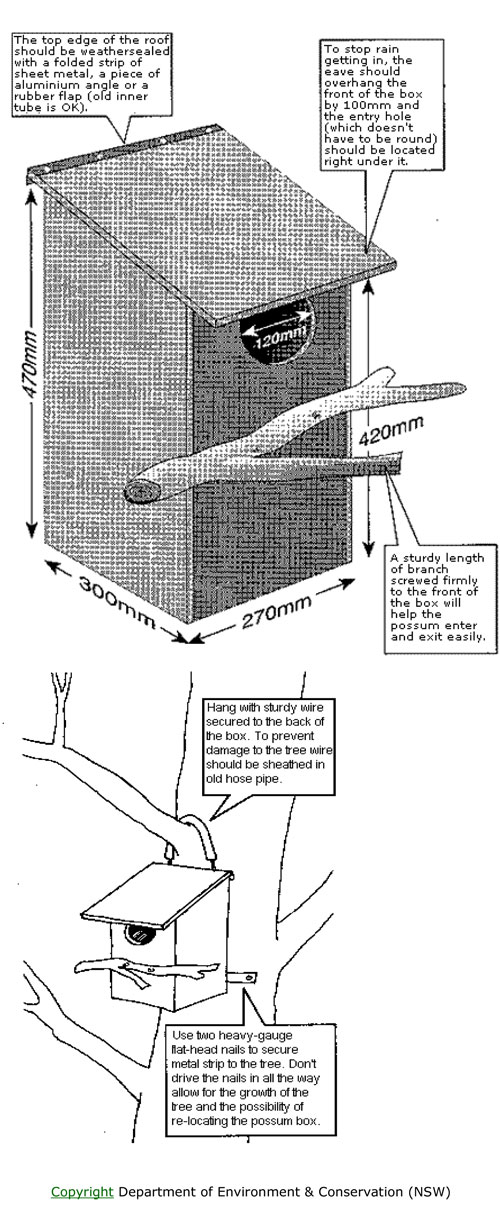 Marine ply at least 12mm in width is recommended for making possum boxes. Chipboard is not suitable as it disintegrates rapidly outdoors.